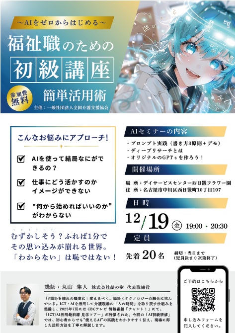 去る2025年12月19日、当法人が運営するデイサービスセンター西日置フラワー園にて、一般社団法人全国介護支援協会主催の「福祉職のためのAI初級講座」が開催されました。